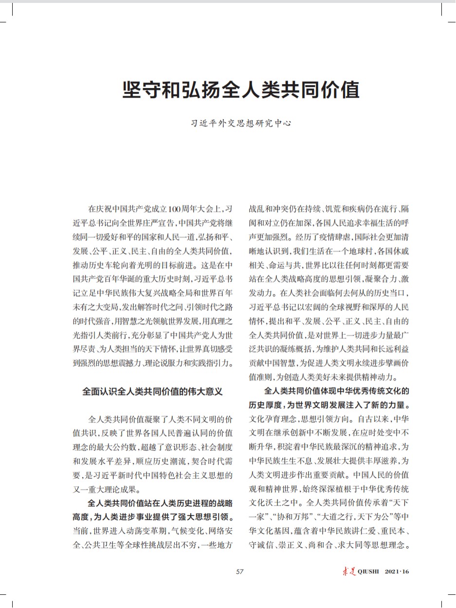 2021年8月16日出版的第16期《求是》杂志发表习近平外交思想研究中心重点理论文章《坚守和弘扬全人类共同价值》。全文如下: