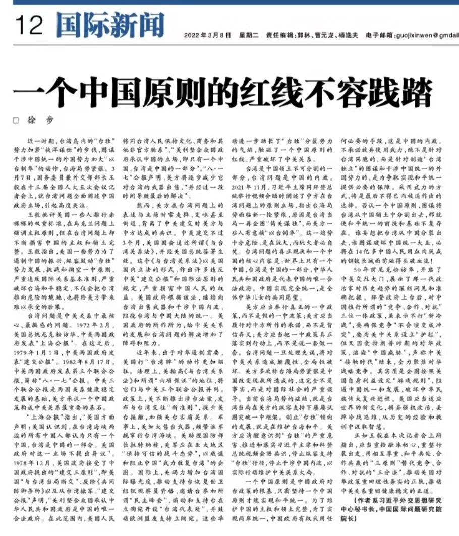 2022年3月8日,中国国际问题研究院院长徐步在《光明日报》发表文章《一个中国原则的红线不容践踏》,文章亦发表在《光明日报》手机客户端。