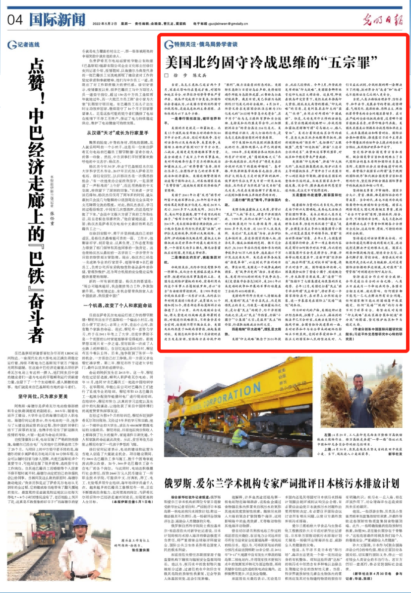 5月2日,中国国际问题研究院徐步院长、习近平外交思想研究中心陈文兵特约研究员在《光明日报》发表文章《美国北约固守冷战思维的“五宗罪”》,全文转载如下。