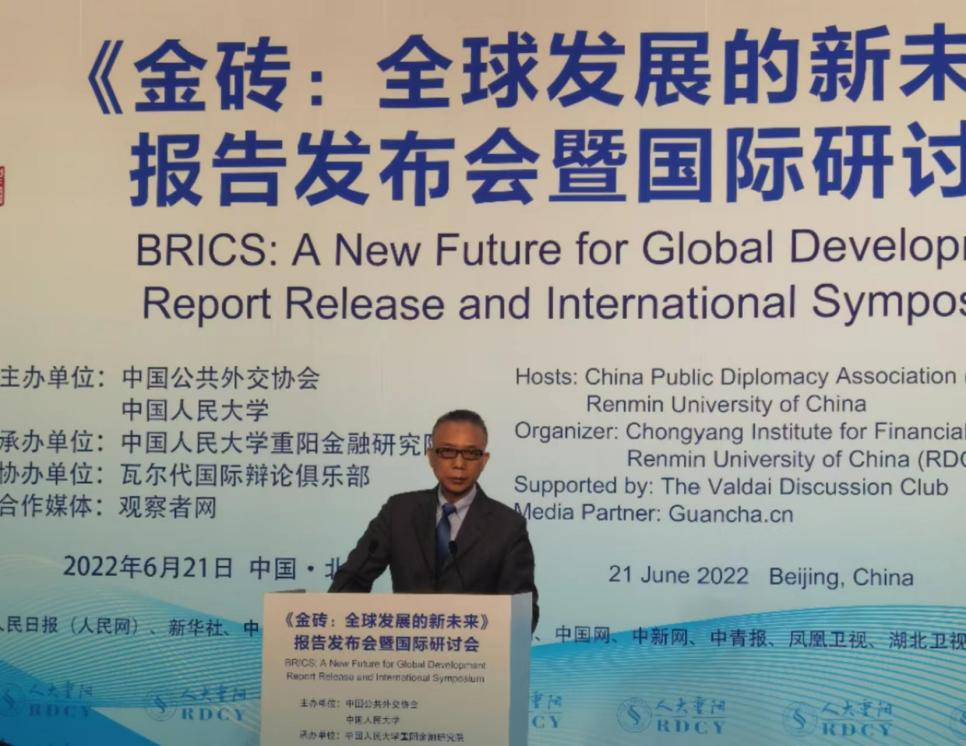 6月21日,徐步院长应邀出席《金砖:全球发展的新未来》报告发布会暨国际研讨会。该活动由中国公共外交协会和中国人民大学主办,中国人民大学重阳金融研究院承办。中国公共外交协会会长吴海龙和中国人民大学副校长王轶致辞,徐步院长作主题演讲。来自巴西、俄罗斯、印度和南非的专家学者参加研讨。重阳金融研究院执行院长王文主持会议,中国公共外交协会秘书长霍颖出席。