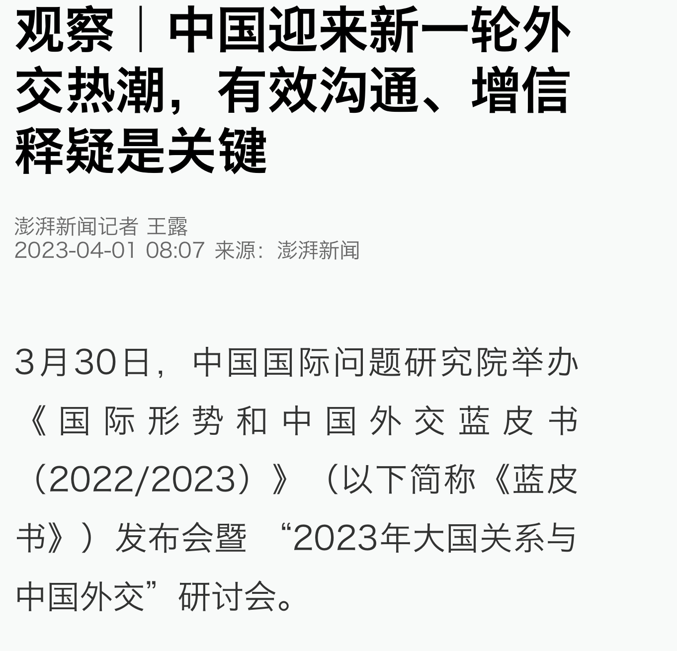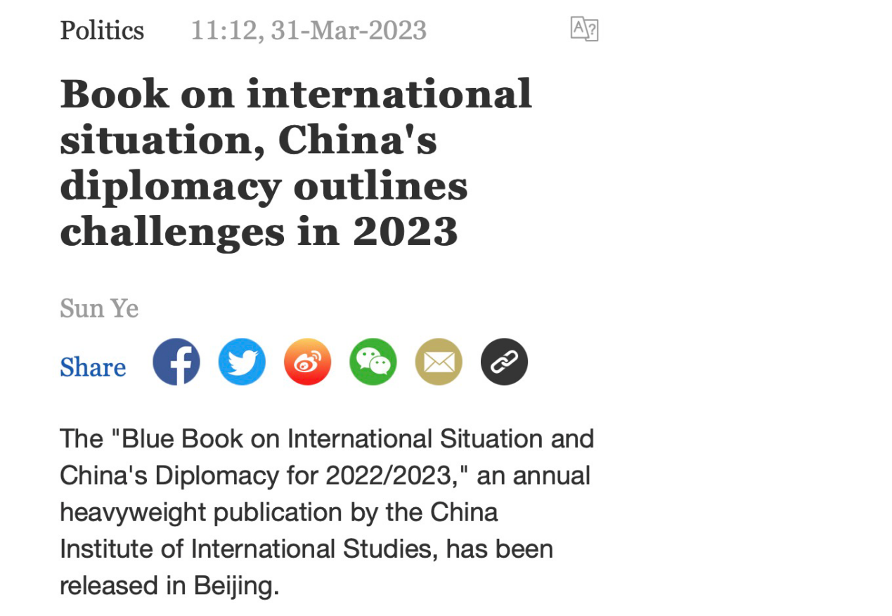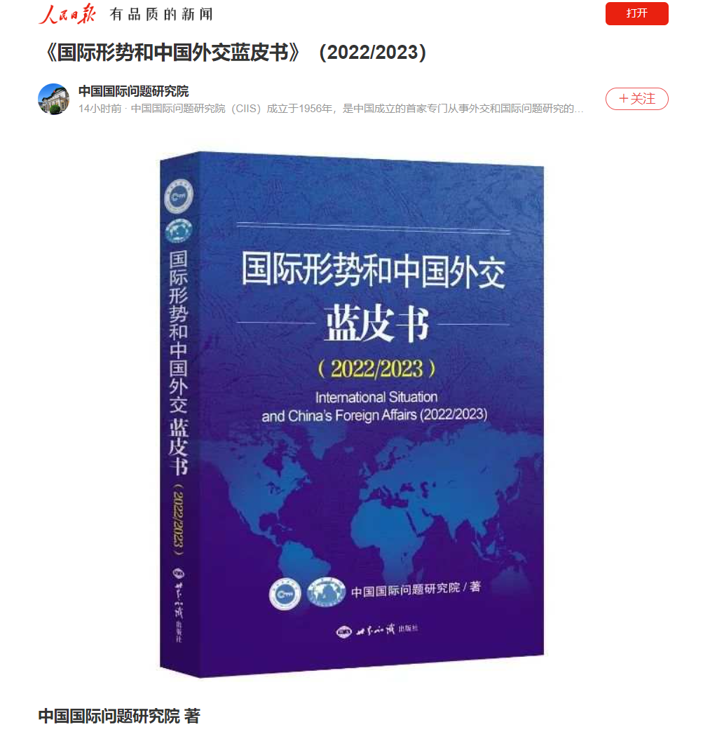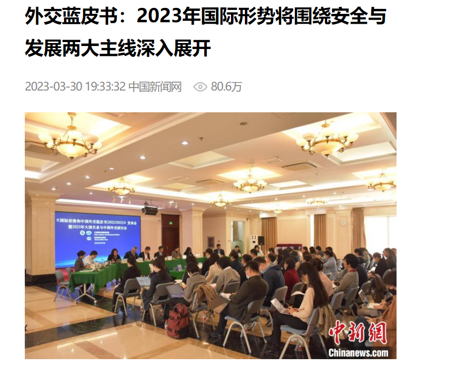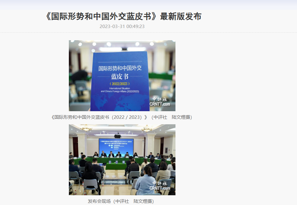 3月30日,中国国际问题研究院和世界知识出版社在北京共同举行《国际形势和中国外交蓝皮书(2022/2023)》(简称《蓝皮书》)发布会暨“2023年大国关系与中国外交研讨会”。《蓝皮书》由中国国际问题研究院徐步院长担任主编,荣鹰副院长和刘卿副院长担任副主编。刘卿副院长出席并主持会议,中国国际问题研究院于江副院长、世界知识出版社汪琴副社长、以及中国现代国际关系研究院傅梦孜副院长、外交学院孙吉胜副院长、社科院亚太与全球战略研究院沈铭辉副院长、社科院国际合作局赵江林副局长、北京外国语大学国际关系学院谢韬院长、清华大学国际关系学系刘丰教授、中国外文局美洲中心刘云云副总编辑、《中国日报》张曦编辑等专家学者与媒体代表出席会议并发言。与会专家学者现场回答记者提问,分享对国际形势和中国外交等一系列问题的看法。20余家重要媒体代表及《蓝皮书》编委、作者与会。