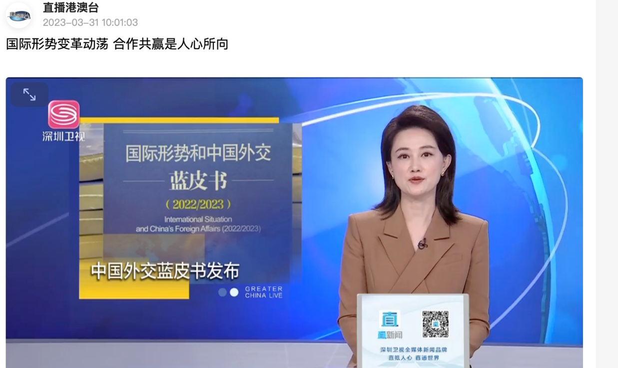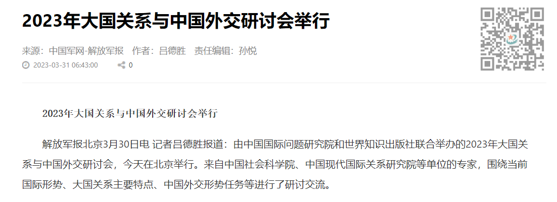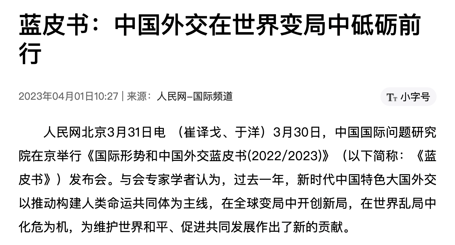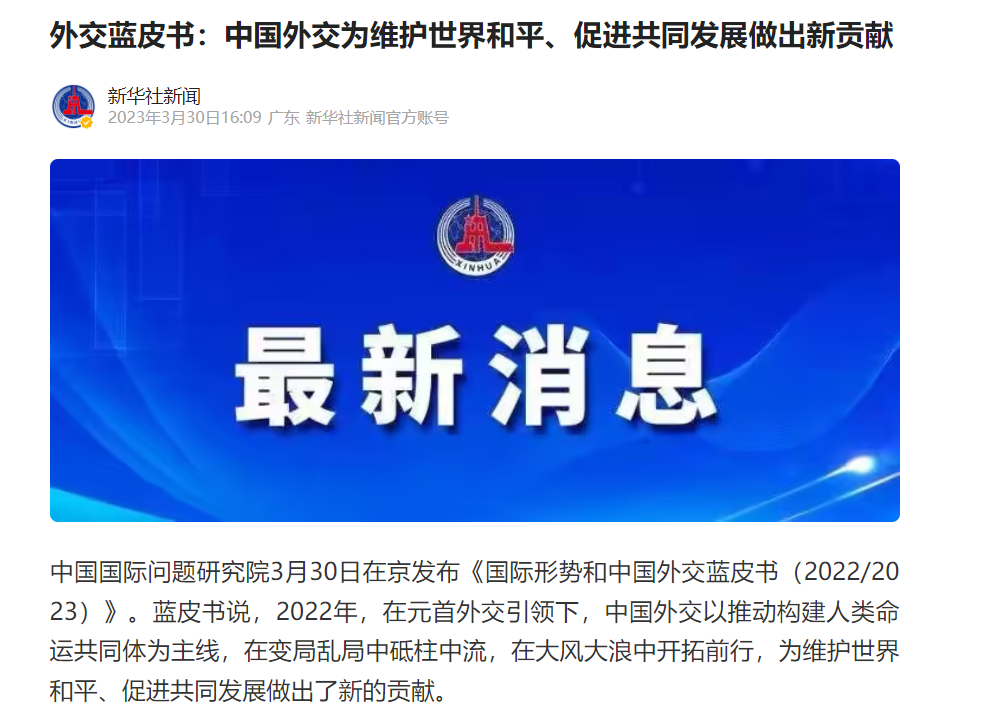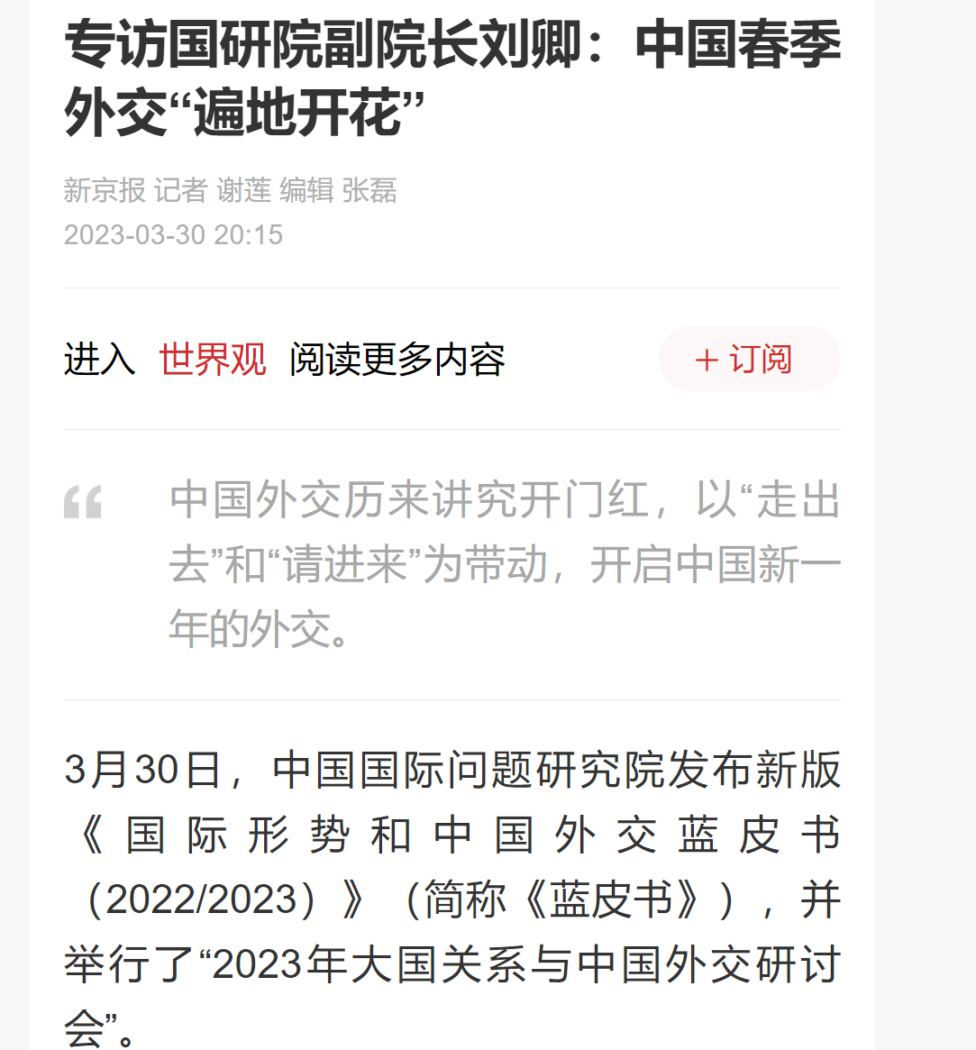 3月30日,中国国际问题研究院和世界知识出版社在北京共同举行《国际形势和中国外交蓝皮书(2022/2023)》(简称《蓝皮书》)发布会暨“2023年大国关系与中国外交研讨会”。《蓝皮书》由中国国际问题研究院徐步院长担任主编,荣鹰副院长和刘卿副院长担任副主编。刘卿副院长出席并主持会议,中国国际问题研究院于江副院长、世界知识出版社汪琴副社长、以及中国现代国际关系研究院傅梦孜副院长、外交学院孙吉胜副院长、社科院亚太与全球战略研究院沈铭辉副院长、社科院国际合作局赵江林副局长、北京外国语大学国际关系学院谢韬院长、清华大学国际关系学系刘丰教授、中国外文局美洲中心刘云云副总编辑、《中国日报》张曦编辑等专家学者与媒体代表出席会议并发言。与会专家学者现场回答记者提问,分享对国际形势和中国外交等一系列问题的看法。20余家重要媒体代表及《蓝皮书》编委、作者与会。