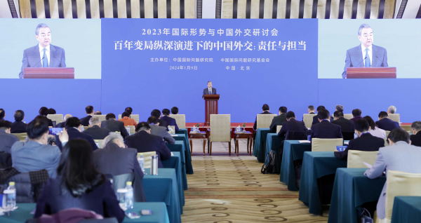 2024年1月9日,中共中央政治局委员、外交部长王毅在北京出席2023年国际形势与中国外交研讨会开幕式并发表演讲。