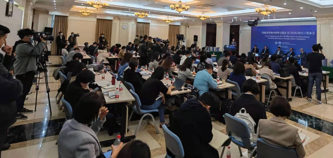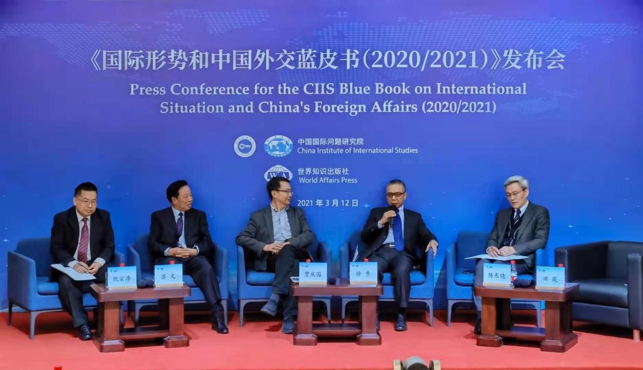 3月12日,中国国际问题研究院举行《国际形势和中国外交蓝皮书》发布会。发布会由CGTN著名主持人田薇女士主持。出席发布会的有中国国际问题研究院徐步院长,世界知识出版社苏文社长,全国政协常委、北京大学国际关系学院前院长贾庆国教授,上海市政协委员、上海国际问题研究院院长陈东晓研究员,中国国际问题研究院常务副院长阮宗泽研究员以及中外媒体代表共约80人。