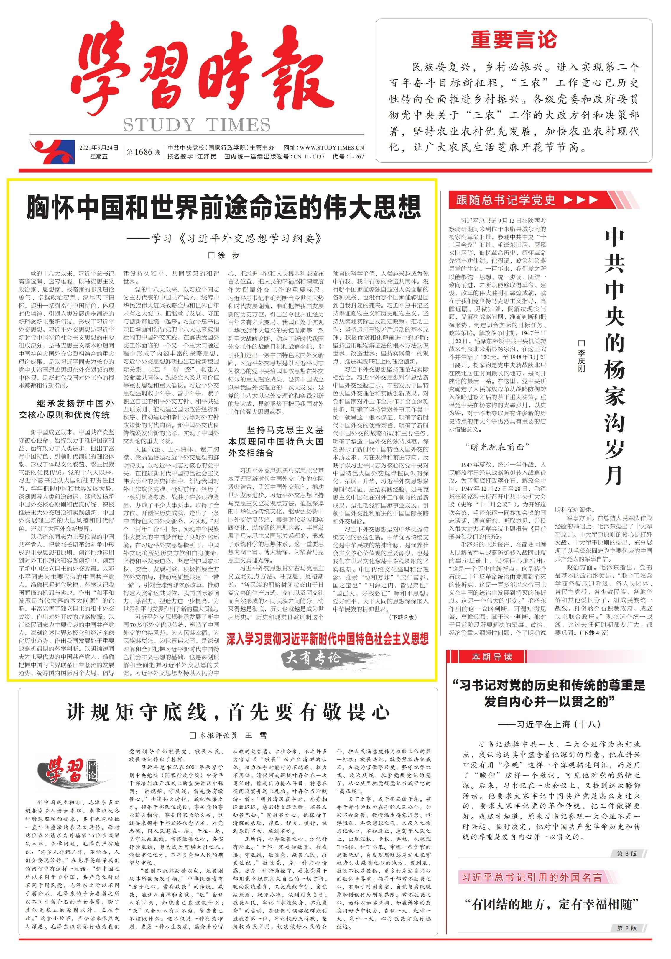 9月24日,中国国际问题研究院党委书记、院长、习近平外交思想研究中心秘书长徐步在《学习时报》头版发表文章《胸怀中国和世界前途命运的伟大思想》,全文转载如下。