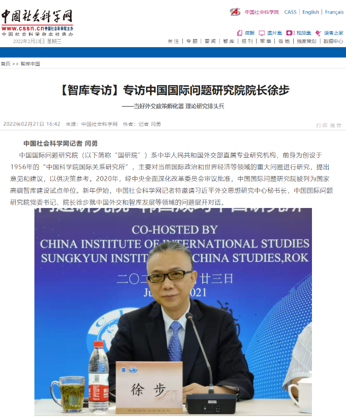 2022年2月21日,中国社会科学网发表《【智库专访】专访中国国际问题研究院院长徐步——当好外交政策孵化器 理论研究排头兵》。