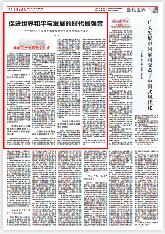 11月25日,习近平外交思想研究中心秘书长、中国国际问题研究院党委书记、院长徐步在《学习时报》发表文章《促进世界和平与发展的时代最强音——党的二十大报告在国际形势和中国对外政策方面有哪些关注点》。全文转载如下。
