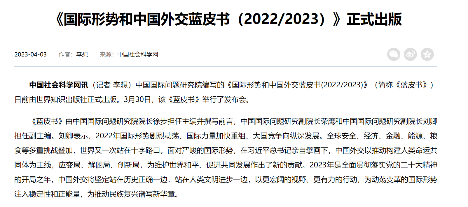 《国际形势和中国外交蓝皮书》引起媒体广泛关注