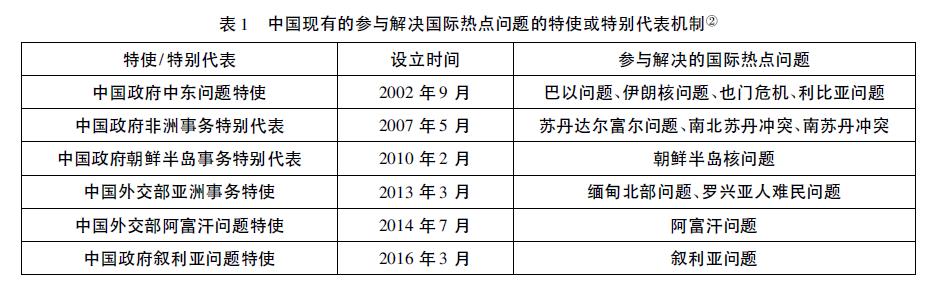 截至目前,中国共设有6个参与国际热点问题解决的特使或特别代表机制。这些特使通过在热点问题当事方之间斡旋、走访地区国家、协调世界大国的立场、参与联合国及国际社会建立的相关多边机制等方式,分别在参与调解巴以问题、南北苏丹问题、苏丹达尔富尔问题、朝鲜半岛核问题、罗兴亚人难民问题、阿富汗问题、叙利亚问题、也门问题上发挥了重要作用。