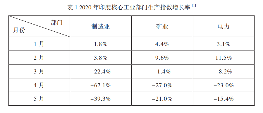 第四,扩产能,打造独立的供应链、产业链。疫情导致印度工业产能严重萎缩。3月以来,印度的工业生产指数(Index of Industrial Production,IIP)断崖式下跌,是1994年有记录以来的最严重萎缩。据印度中央统计局数据,3月印度工业生产指数与去年同期相比萎缩18.3%,4月工业生产进一步降低,同比缩水57.6%,5月伴随经济适当“解封”有所好转,但与2019年5月同比仍萎缩34.7%。由表1可知,2020年之初,制造业、电力和采矿三大核心部门与去年同期相比均实现小幅增长,但3月以来,这三大部门纷纷出现不同程度萎缩,其中,制造业部门衰退程度最为严重,2020年4月,制造业生产与去年同期相比萎缩67.1%,5月虽有所好转,但与2019年5月相比仍萎缩近40%,除制药业以外,几乎所有的制造业细分部门都出现负增长。与东亚、东南亚经济体相比,印度制造业本就羸弱,占GDP的比重长期横亘于15%左右的低位水平,疫情期间又受到如此剧烈冲击,亟需政府采取行动,帮助制造业恢复元气,莫迪屡次敦促民众购买本地产品,并采取关税、质量检测、进口许可证等非关税壁垒来阻碍进口,实际是期望借内需来保障印度制造业的市场需求。