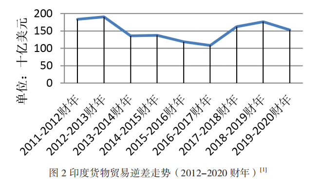 第二,“自给印度”运动强调减少进口增加出口,是基于对印度对外贸易,尤其是货物贸易长期走势的担忧。如图2所示,自2016-2017财年开始,印度的货物贸易逆差开始走高,到2018-2019财年,逆差数额已经高达1766亿美元,与曾经的历史高峰2012-2013财年的1903亿美元相差无几。如果说2012财年前后的货物贸易高逆差很大程度上是由印度主要的进口产品——石油价格上涨造成,那么到2019年财年,国际原油价格在60美元上下浮动,远低于2012财年时期100美元的高位水平,但当年的货物贸易逆差仍然高企。并且,这一巨额逆差还是在莫迪政府显著提高进口关税的背景下实现的。据WTO数据显示,自莫迪2014年上台以来,印度实际关税水平由13.5%上升至2019年的17.6%,贸易加权平均关税水平也由6.2%升至2019年的10.3%。这一指标说明,尽管莫迪上台后大力推进“印度制造”计划,标榜自身在推动经济发展上的成就,尤其是批判前任辛格政府时期巨额贸易逆差的“治理无方”,但莫迪政府本身在解决货物贸易赤字问题上并无太大作为,印度的对外货物贸易逆差问题没有得到改善,反而再度扩张。虽然疫情带来的贸易中断使印度难得地出现贸易顺差,但是,如果没有政策性措施的干预,顺差不会持续太久。莫迪政府此次在“自给印度”倡议下加高进口关税水平,并提高非关税贸易壁垒,可以看作是对印度长期货物贸易逆差的提前干预。