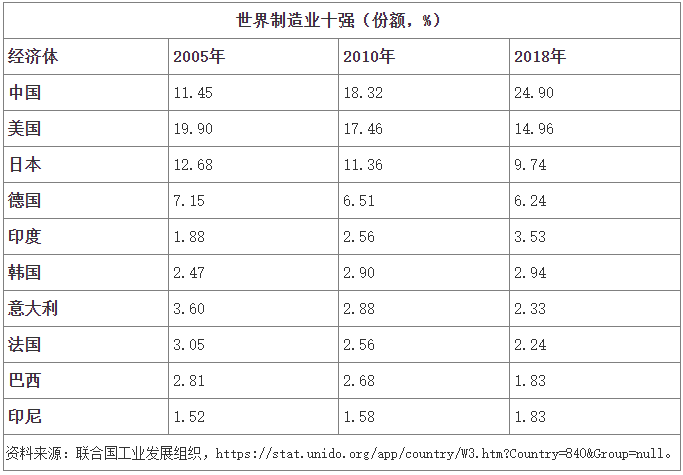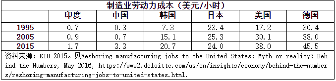 从各国在世界制造业中的比重看,发达国家份额下降,新兴经济体份额提高。2010年,中国超过美国成为制造业第一大国。尽管奥巴马提出“再工业化”,特朗普声称让制造业“回归”,但美国在全球制造业中的份额依然减小。未来一段时期,中国、印度等新兴经济体城市化进程加快,人民生活水平提高,在世界制造业中的份额仍将保持或提高。